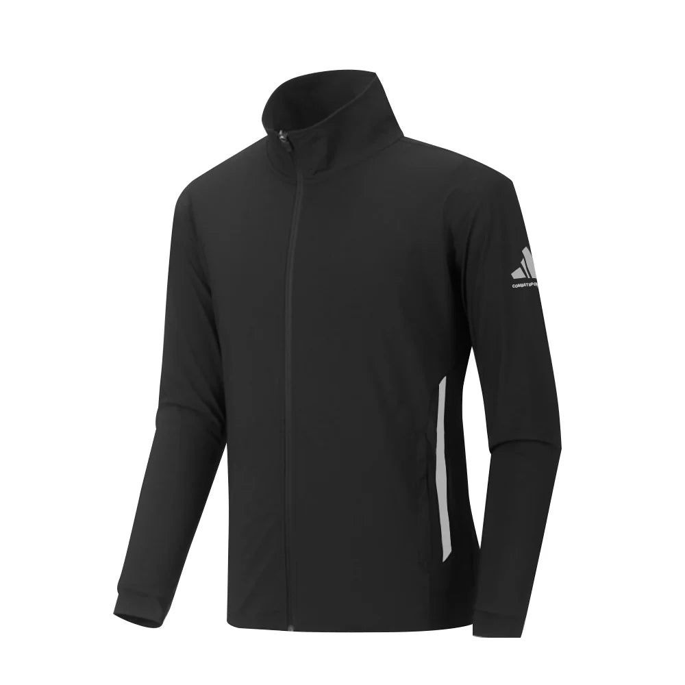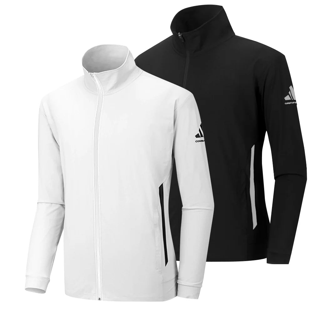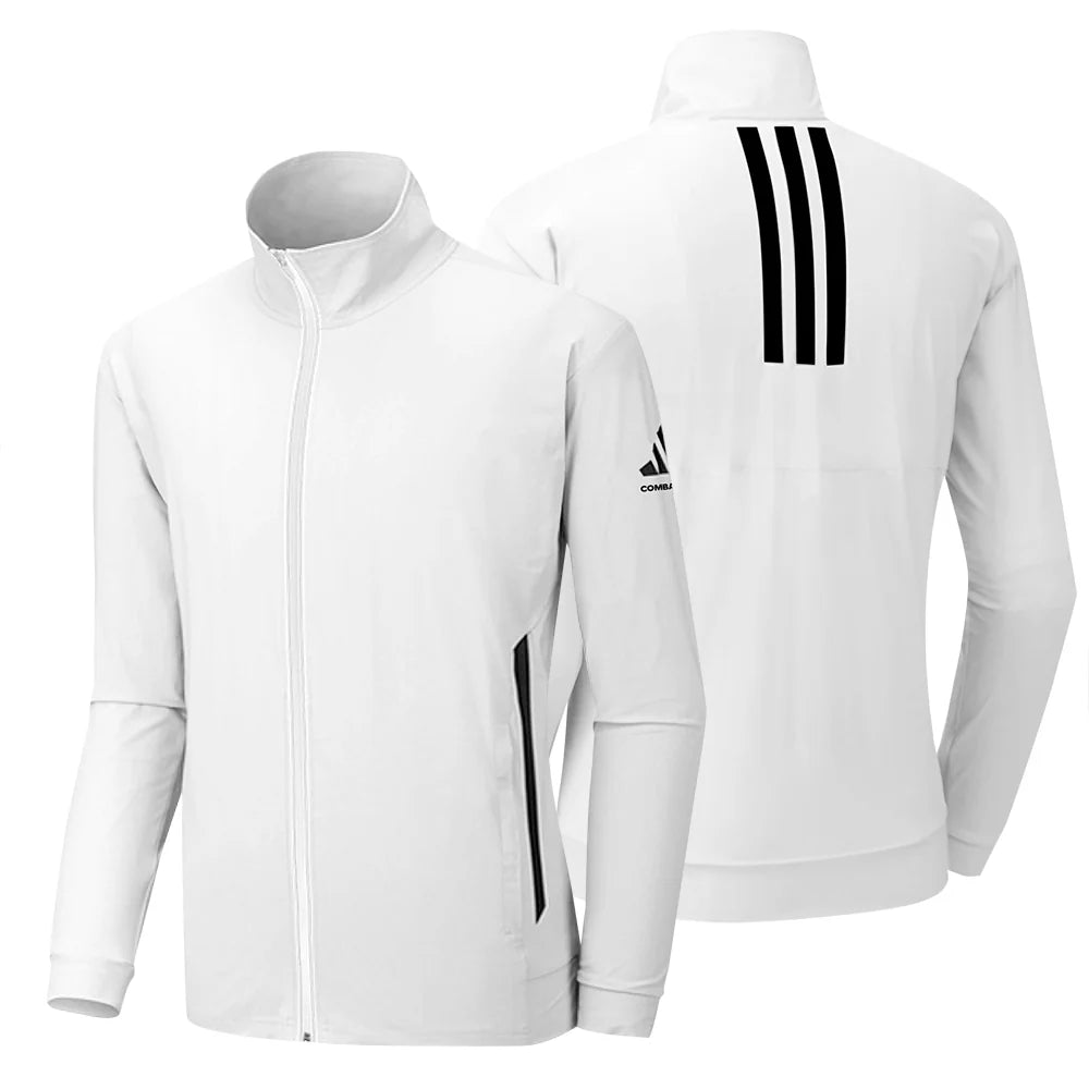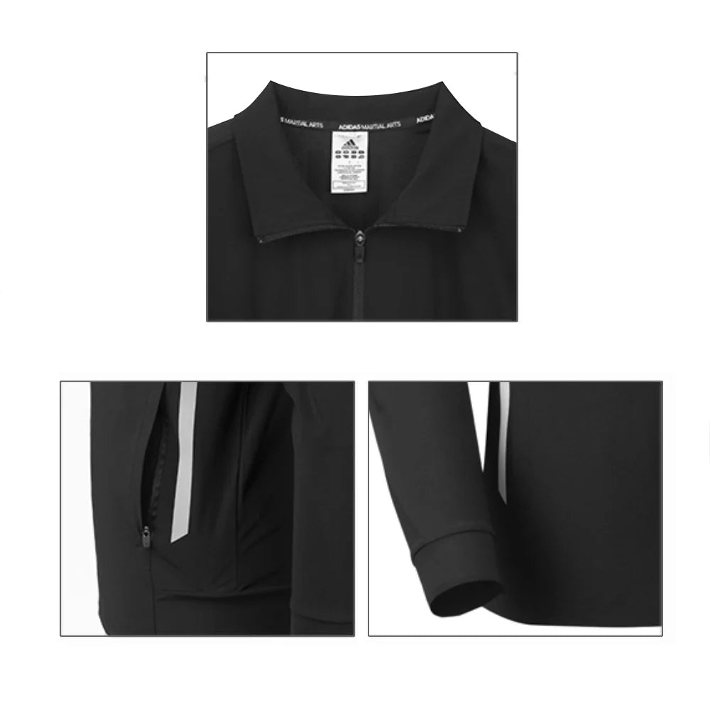 A Taekwondo sparring uniform consisting of a white body with black collar, black belt, and the Adidas logo on the right chest area.