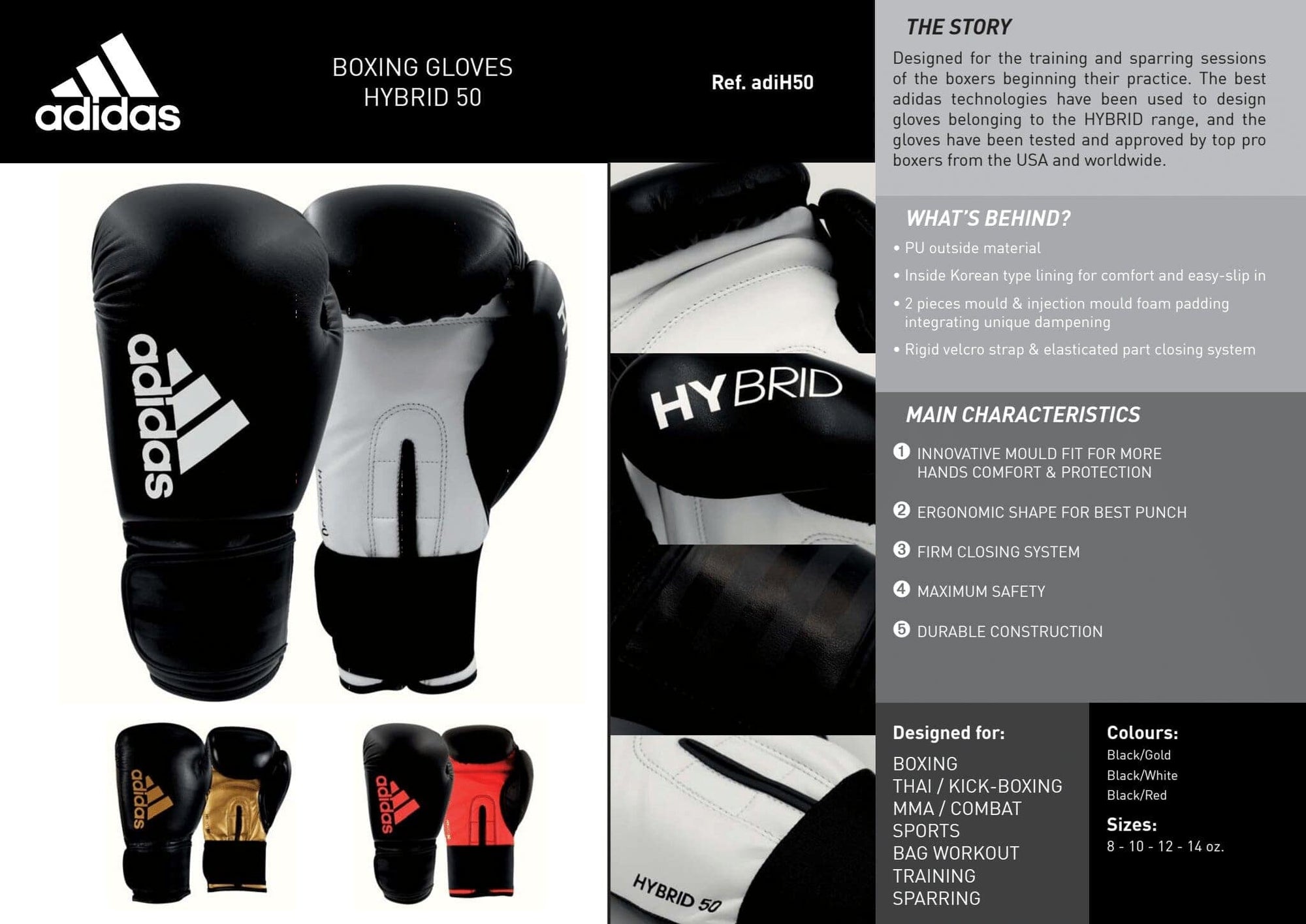 Adidas Hybrid 50 Boxing and Kickboxing Gloves is tuned for balanced protection and feel in daily training. Supportive structure and responsive padding help you work harder for longer sessions. From training sparring to power cycles, run these as your sparring gloves or primary bag gloves.